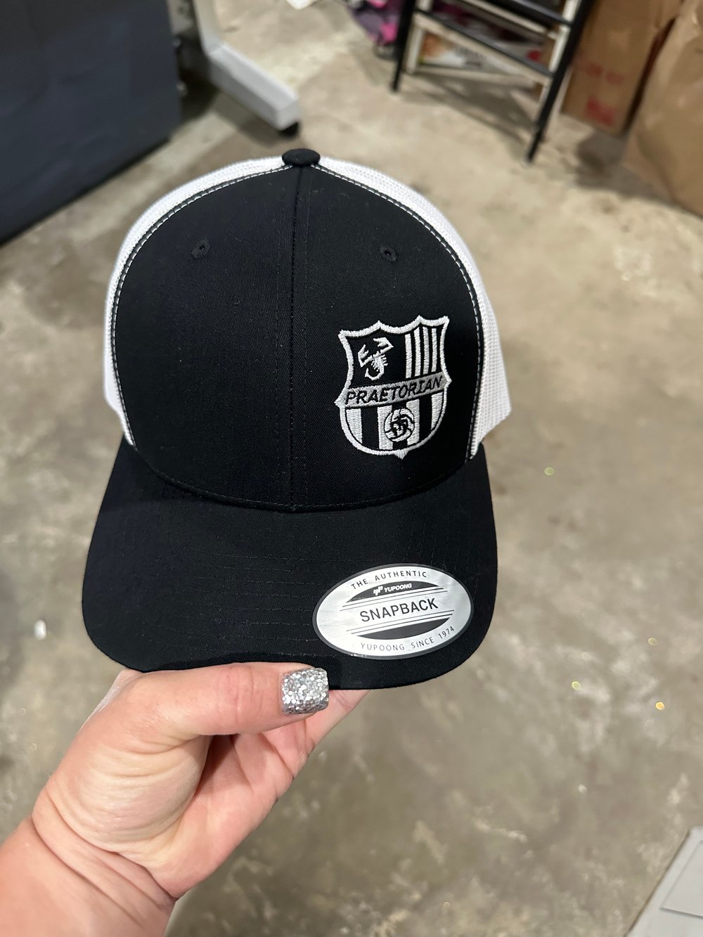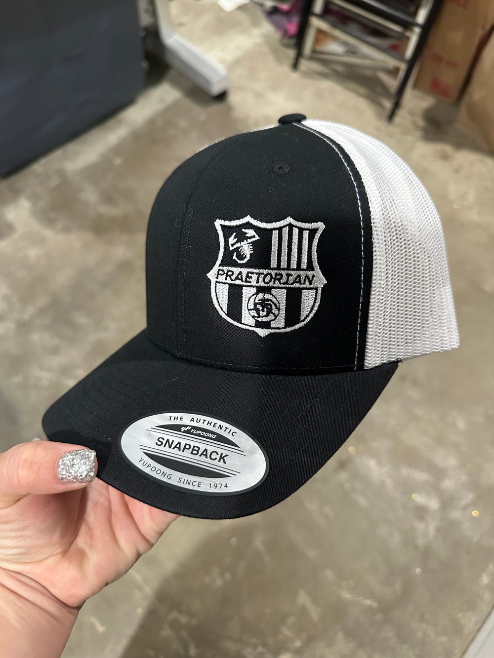 This is a Richardson 112 classic curved billed trucker hat in black & white. The shield logo will be embroidered on the side front panel of the hat. A portion of the proceeds go back to the Praetorian water polo club. If you prefer to pick up your order. Use code "Localpu" at checkout to deduct the shipping costs.